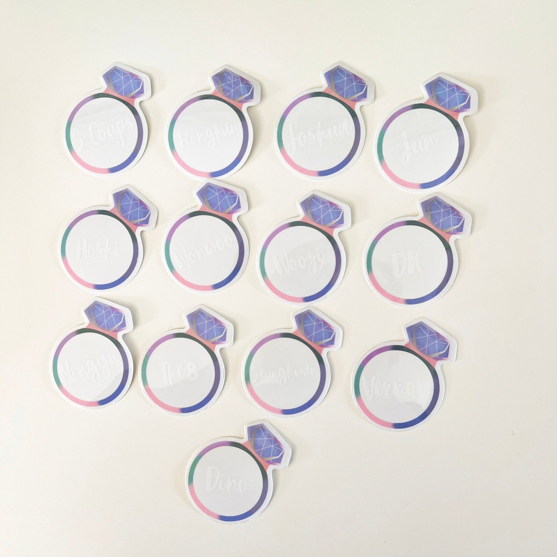 We made these diamond ring stickers so Carats can have a cute way to showcase their Seventeen bias! These clear stickers are in the shape of a diamond ring and are inspired by their lighstick! We have a lighter one which is like the carat bong version 2 and a darker one which is like version 3!