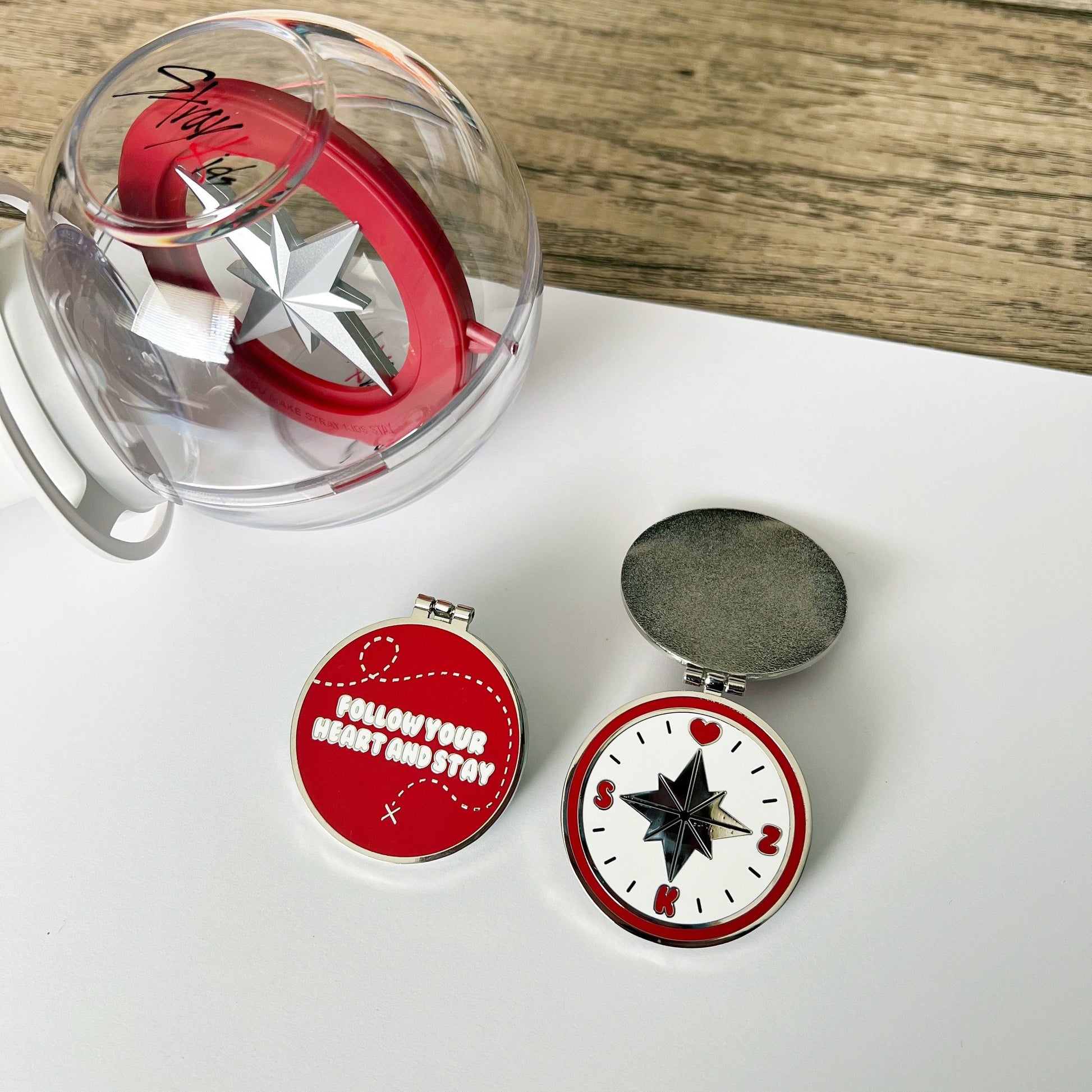 This hinged pin is shaped like a compass to resemble the nachimbong! It says "Follow your heart and stay" on the outside and on the inside instead of the typical cardinal directions it has S K Z with a heart as north! This pin is made with lots of love from Stays for Stays!